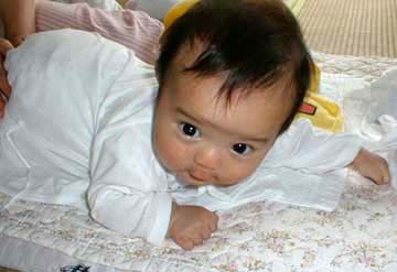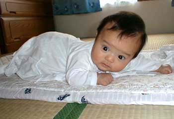 うつぶせにしても、頭が持ちあがるくらいになってきたのだから、 首の力もついてきたってことですかね。 |