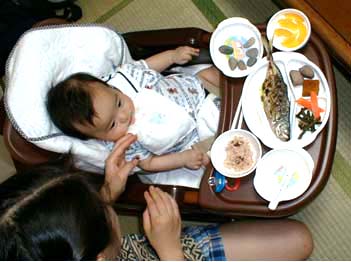 この日は「お食いぞめ」をしました。まだ食べられるわけじゃないけど、 こうやって食べるふりをすることで、将来食べ物に困らないように祈願するそうです。 |