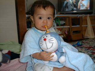 誕生日にたかし(義弟もしくはおじちゃん)に送ってもらった ドラえもん電報のタケコプターはおいしそうです。 思ったよりしっかりしたドラえもんに父さん一本取られました。 |