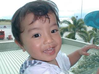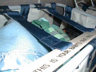 これは飛行機内。バシネットと言う赤ん坊用の折りたたみベット。 本当ならもうこれに乗るような歳ではないのですが、 廉は寝るときうつ伏せで足を縮めて寝るのですっぽり入ってしまいました。 |