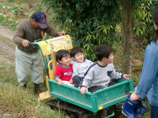 農作業用の運搬車に乗せてもらい、楽しそうです。 |